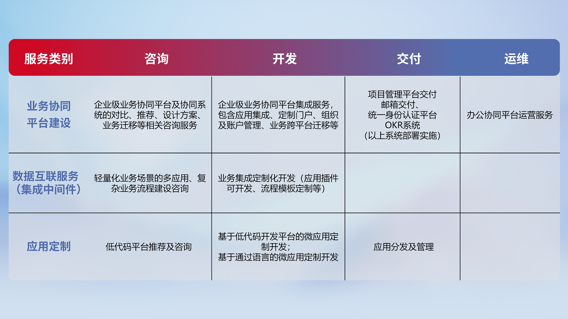 针对钉钉、、企微、、、IDaas等平台级产品提供产品的规划、、、、方案、、交付、、定制化开发等服务,,实现如统一协同办公、、、智能客户服务、、、、混合会议管理、、、智能数据查询、、、、等业务场景,,,实现数字化转型。。。