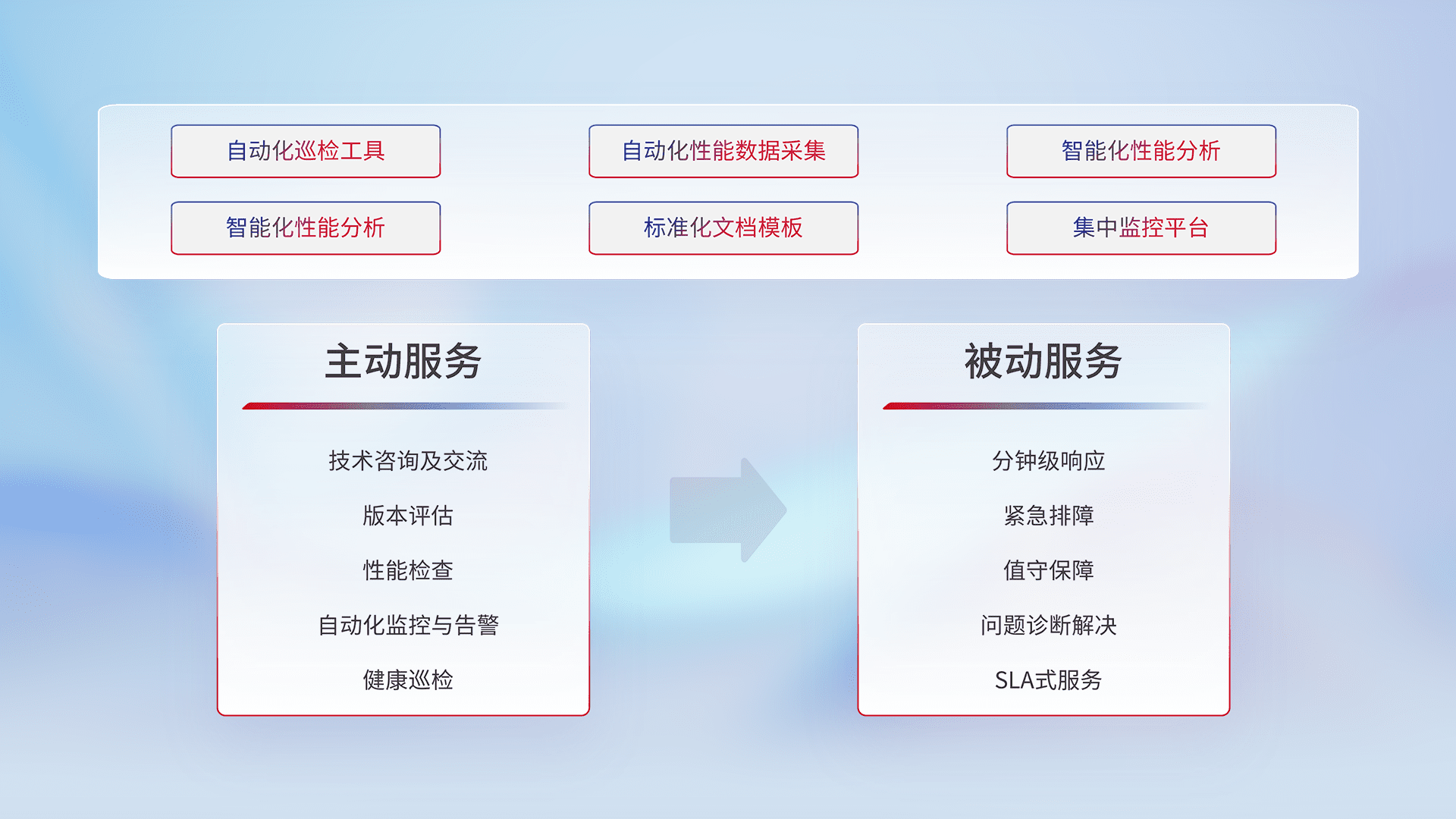 智能化工具和标准化文档,,,,保障服务质量,,,提供主动服务(包含技术咨询、、、版本评估、、、、性能检查、、、、自动化监控与告警、、健康巡检)和被动服务包含(分钟级响应、、、、紧急排障、、、值守保障、、、问题诊断解决、、SLA服务)。。。。